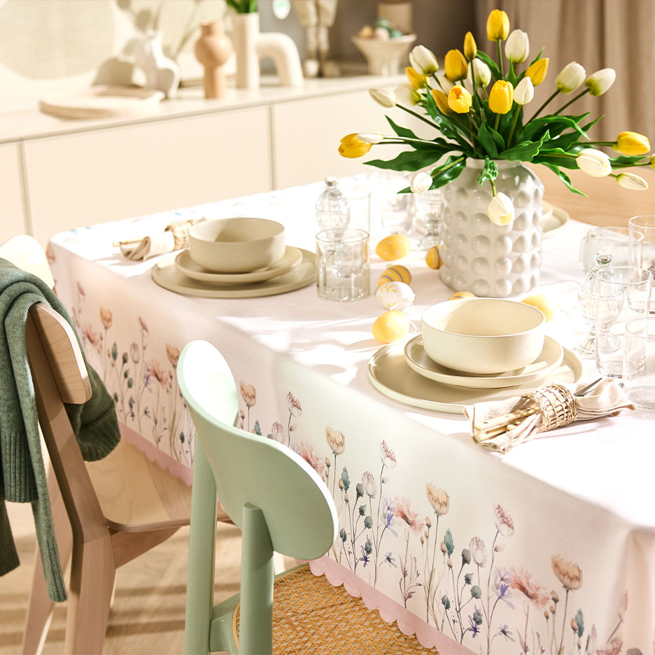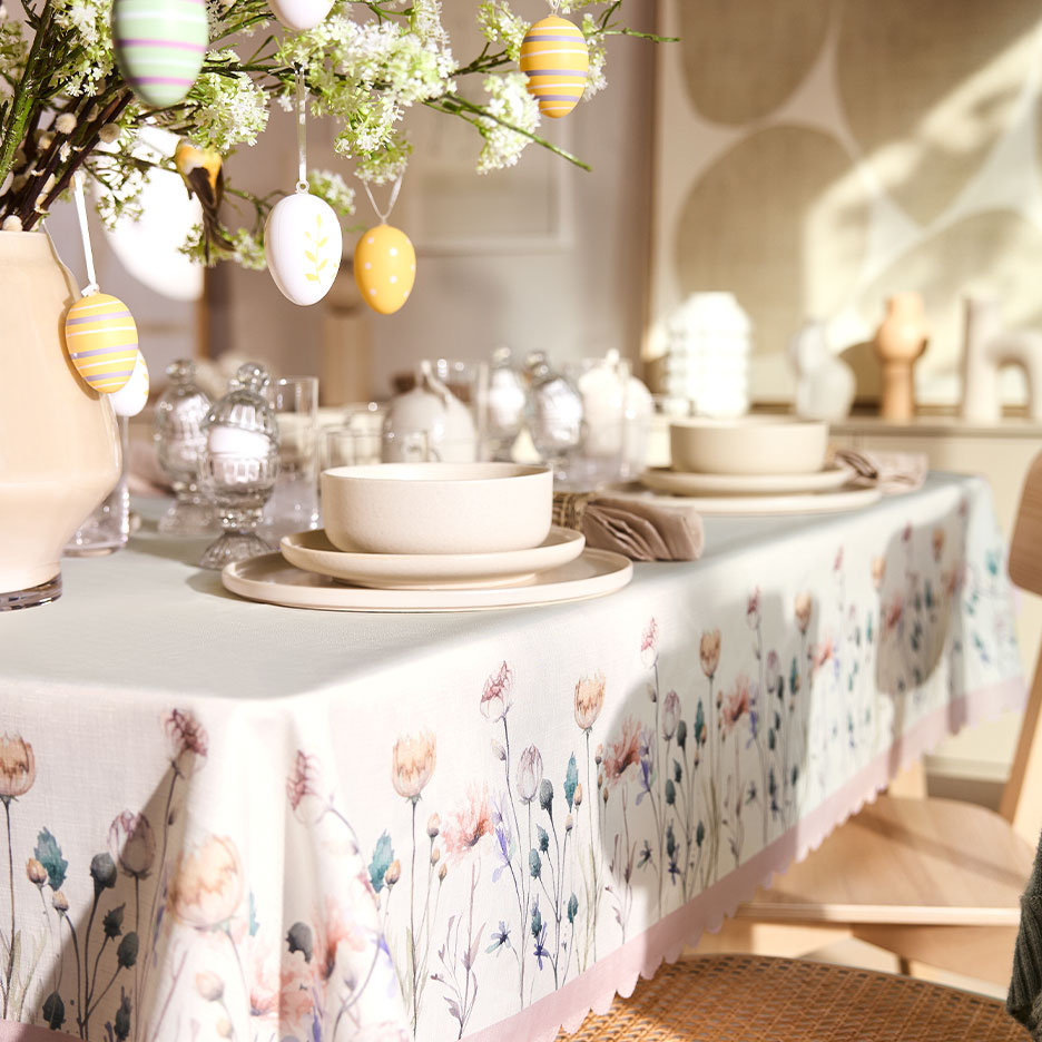 Whether you're hosting a lavish Easter brunch or enjoying coffee and cake for two, your Easter table practically sets itself. A fresh spring tablecloth transforms every table into the perfect centrepiece for the feast. If you opt for naturalistic meadow-flower motifs and trendy colours, the tablecloth can accompany you not only through Easter but throughout spring, summer, and autumn.