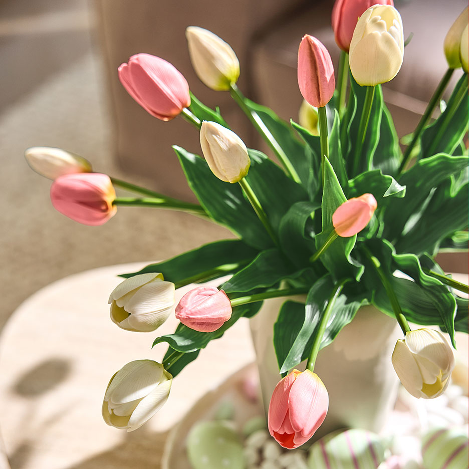 You don't even need a trip to the florist! A high-quality artificial tulip bouquet is almost indistinguishable from the original and stays fresh forever. To give the bouquet a personal touch, mix the flowers with pussy willow twigs and decorate them with Easter egg tags. Decorating professionals rely on harmonious colours, but there are no limits to your imagination.