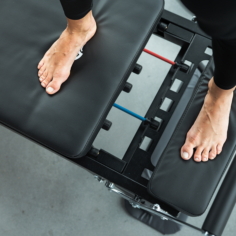 Place one foot on the platform, the other foot on the lying surface. Stretch your arms out to the side. "Consciously focus on the opening in your body and imagine that you are contracting your core. Then open your legs as you exhale and close them again." Remember to do the other side too.